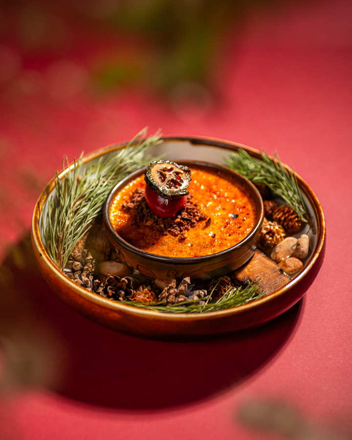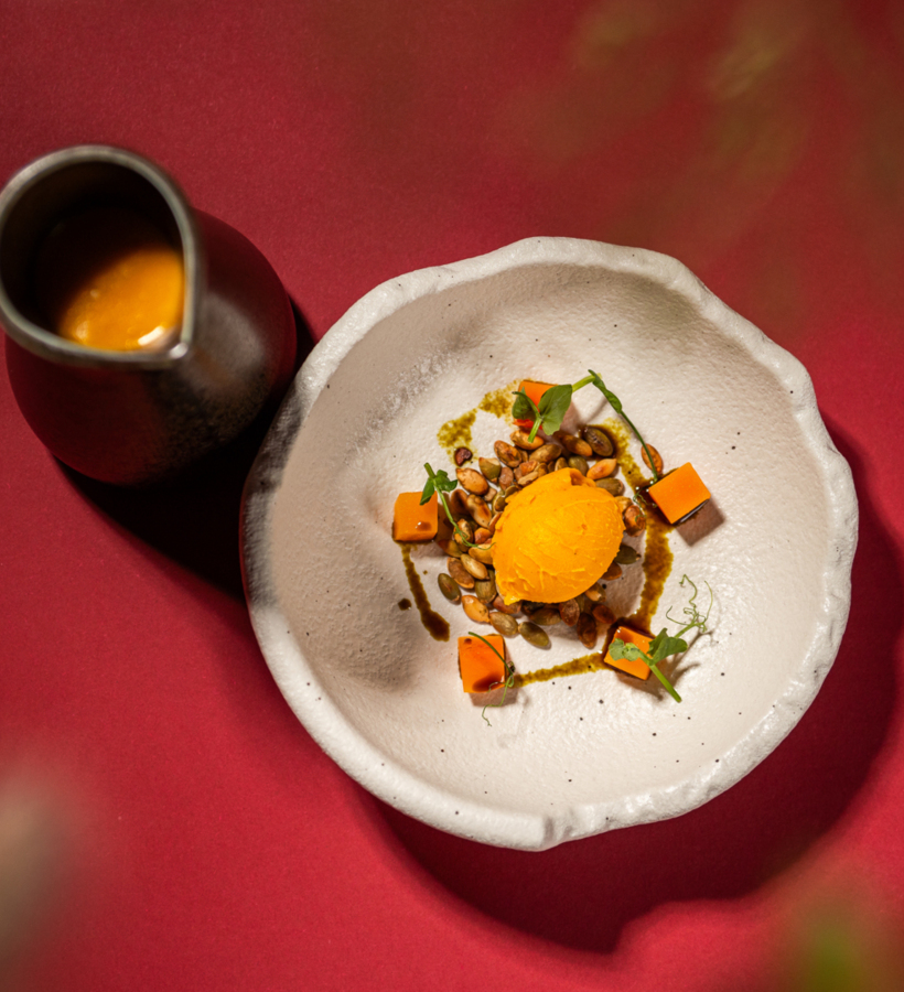 - krem dyniowy / sorbet z dyni z chilli / imbir / kokos kwaśna dynia / olej dyniowy / pestki 29 zł