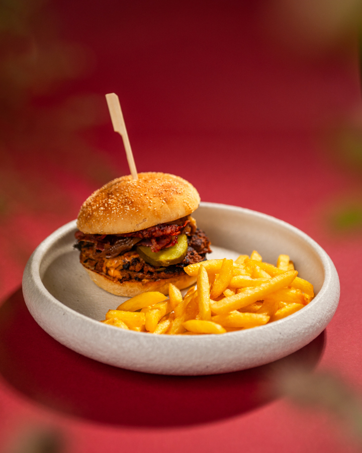 - smash burger / bułka piwna / mięso wołowe duszona cebula balsamiczna / cheddar / piklowane ogórki sos z prażonej cebuli / chrupiący boczek 65 zł