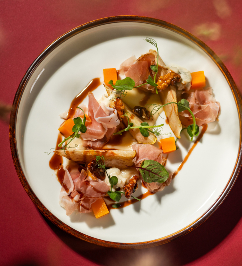 - seler / gruszka pieczona / orzechy w karmelu gorgonzola / szynka parmeńska 45 zł