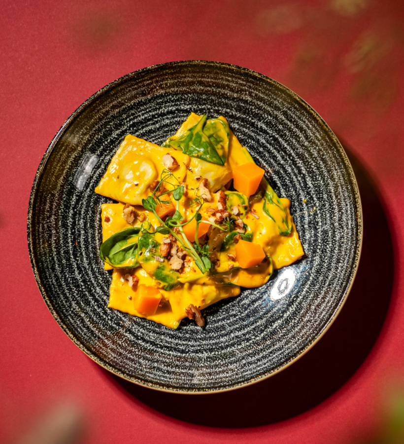 - agnolotti z dynią i ricottą / sos dyniowy z mascarpone i szpinakiem orzechy / piklowana dynia / pecorino romano / szałwia 53 zł