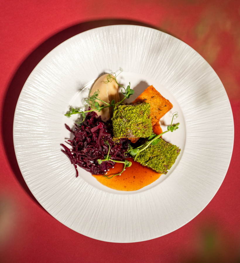 - polędwica z jelenia w ziołowej kruszonce kremowe puree z pasternaku / czerwona kapusta z czarną porzeczką zapiekanka ziemniaczana 139 zł