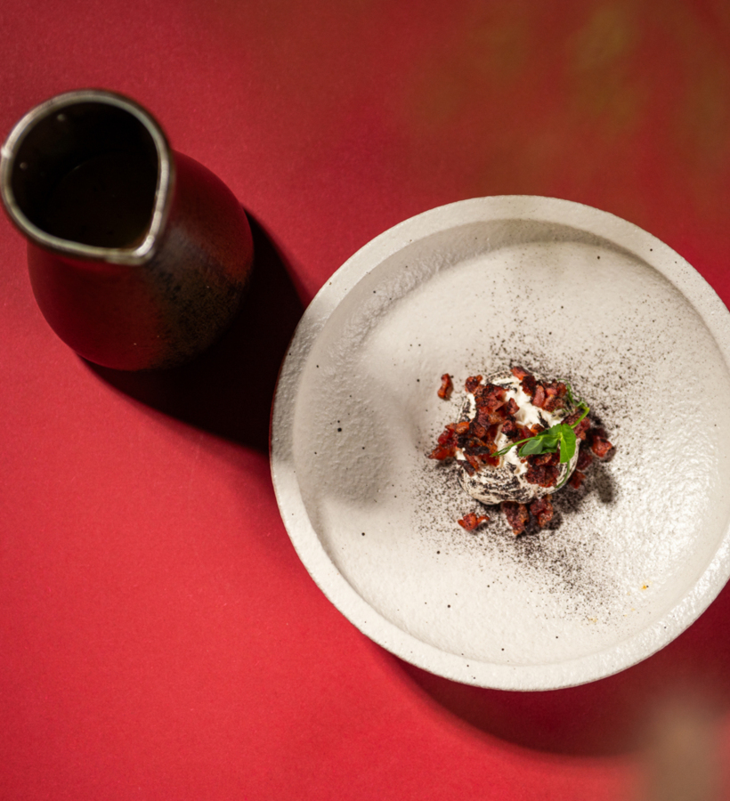 - tatar wołowy / marynowana dynia / szczypiorek majonez z czarnym czosnkiem / żółtko / domowe pieczywo 62 zł