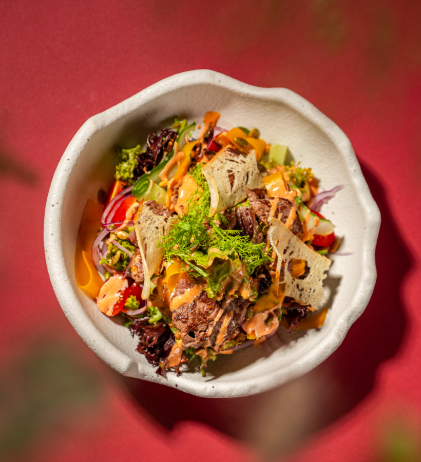 - selekcja sałat / papardelle z dyni / pestki z dyni / soja / chilli polędwica wołowa / pomidory / czerwona cebula / grzanki / sos whisky 69 zł