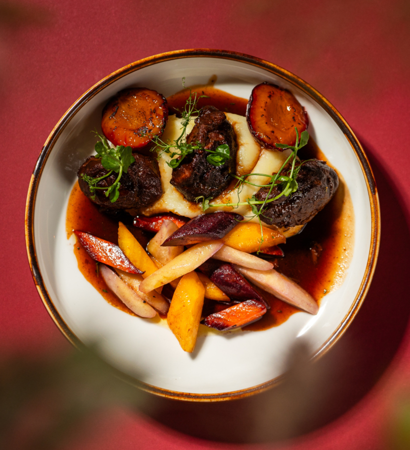 - poliki wieprzowe / maślane puree / karmelizowana śliwka assiette z kolorowej marchwi / sos demi glace 67 zł