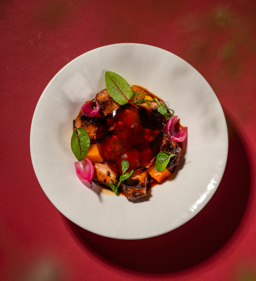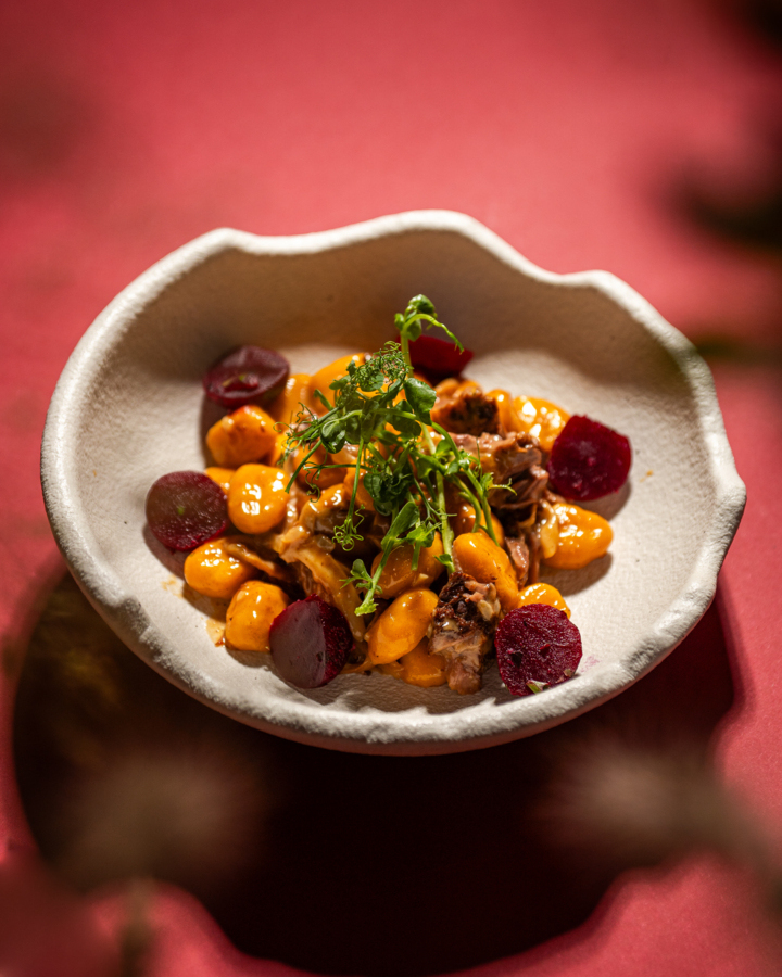 - gnocchi dyniowe / policzek wieprzowy / boczniak / sos demi glace śmietana / szpinak baby / czarny bursztyn 67 zł